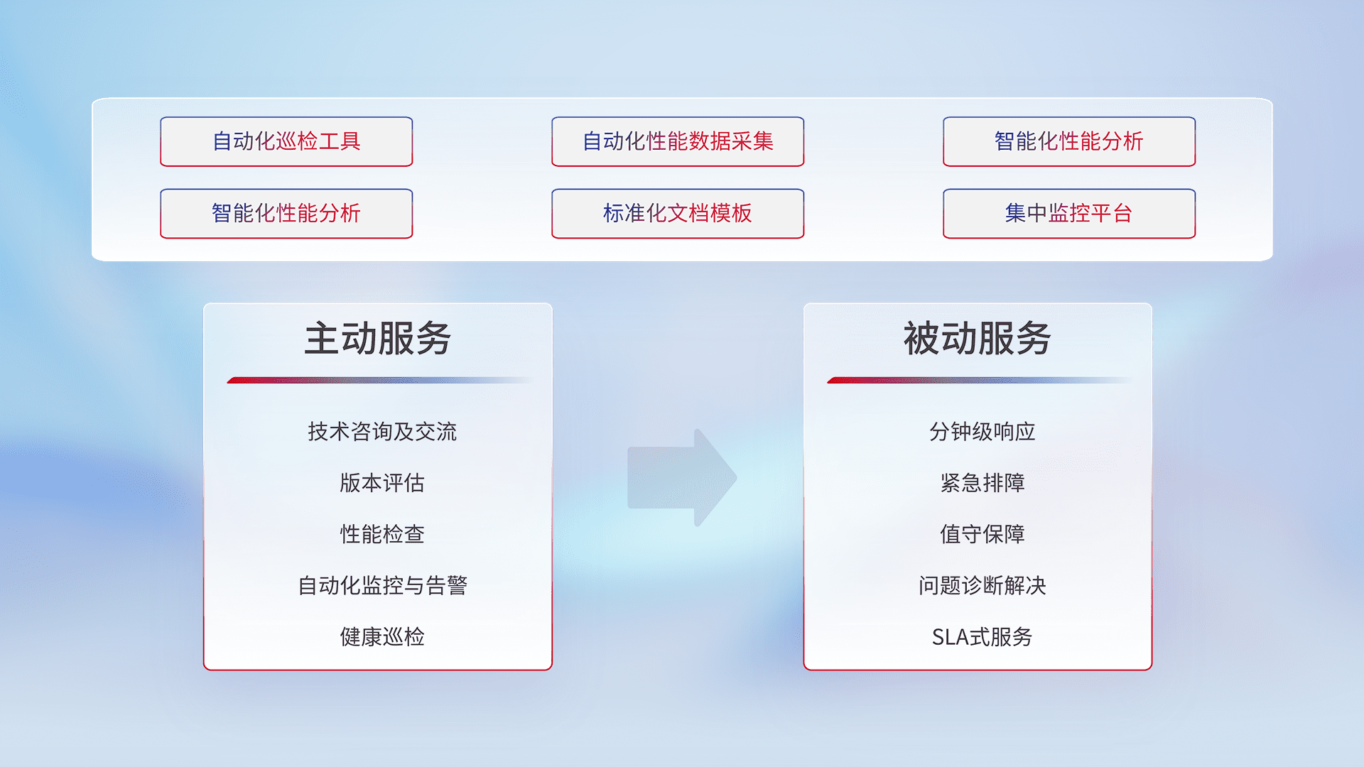 智能化工具和标准化文档,,,保障服务质量,,提供主动服务(包含技术咨询、、、、版本评估、、、性能检查、、自动化监控与告警、、、、健康巡检)和被动服务包含(分钟级响应、、紧急排障、、值守保障、、、、问题诊断解决、、、、SLA服务)。。